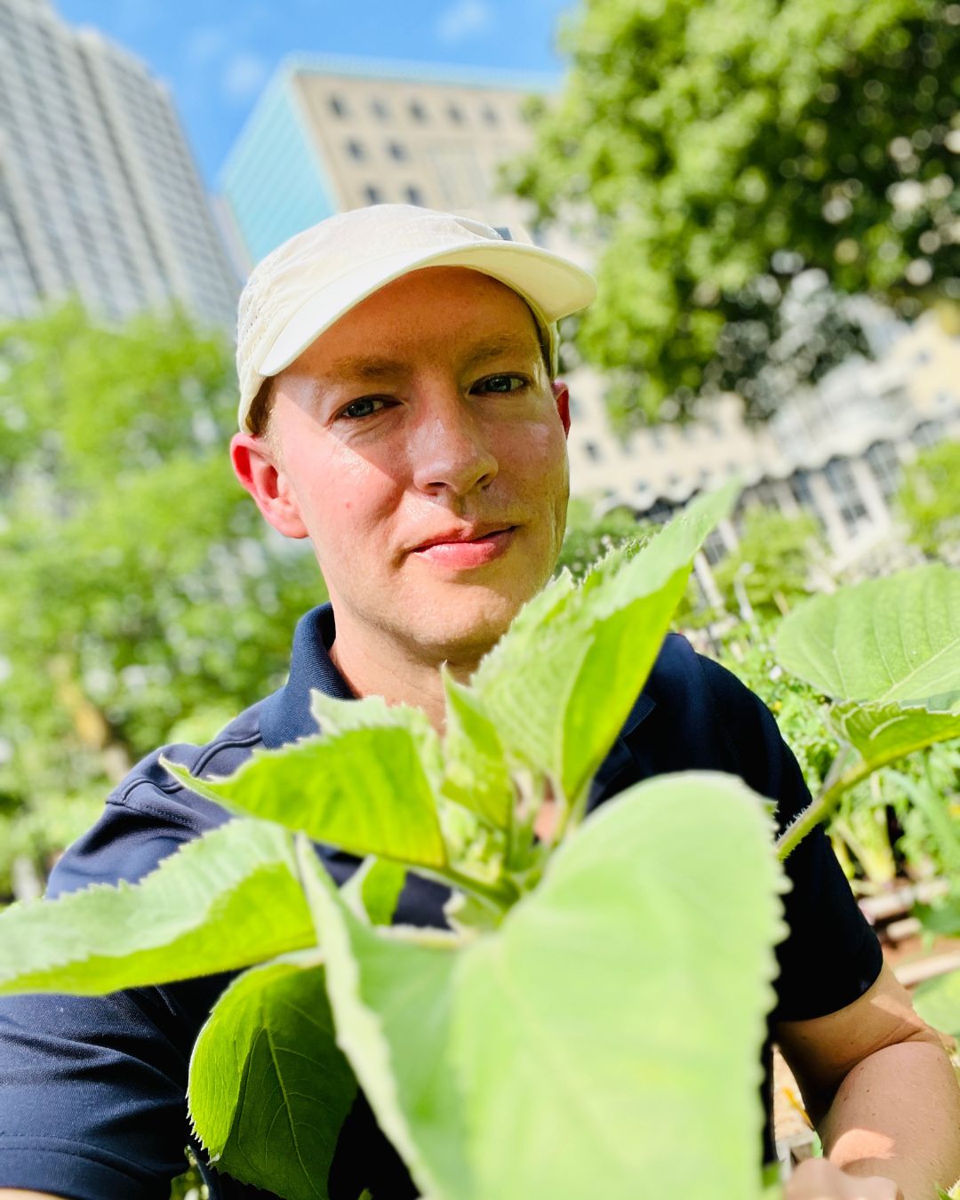 James, Founder and CEO of Pistils & Pollen® stands near his community garden plot, waiting for this Astra Rose Cream Sunflower to bloom.